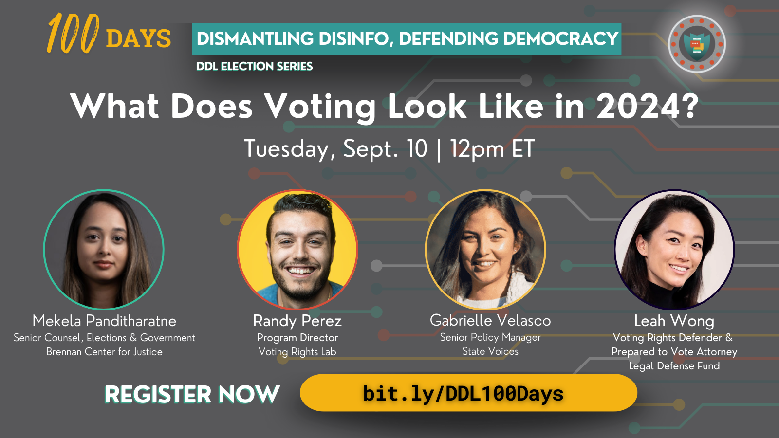 Midnight on Sunday, July 28 marked 100 days until November 5, 2024: Election Day. In the face of well-funded projects and plans to curtail our rights, to define our identities, and foreclose our future, Disinfo Defense League is here to help us all dismantle disinformation and defend democracy. Registration for our two-month panel series is now closed. Many thanks to all those who attended.